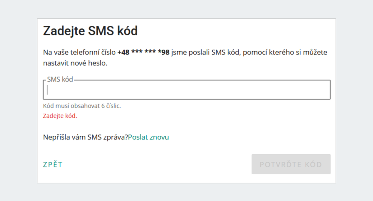 - Zadejte kód, který obdržíte prostřednictvím SMS zprávy. Přesměrujeme vás na stránku, kde si můžete vytvořit nové heslo.